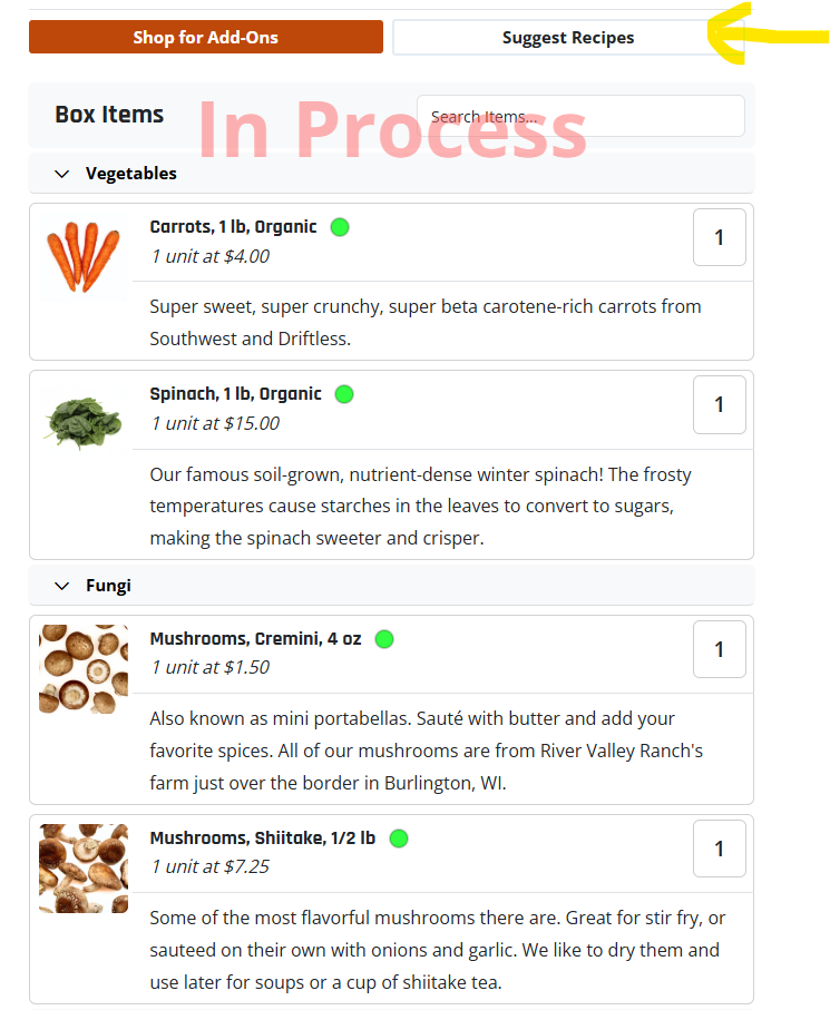 From your box customization screen, click the Suggest Recipes button: